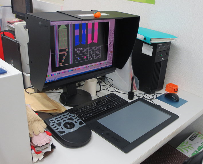 当社では、島精機製作所さんのデザインシステムAPEX3を本社のデザイン室と奈良工場にも設置してデザインのやりとりを行える