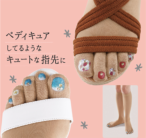 5本指のショートストッキングをベースに、爪にペデュキュアを付けた様な可愛らしいデザインのプリントを施しました。