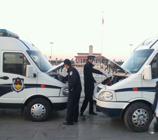 車の間に見えるのは中国国旗と天安門広場の棟です。